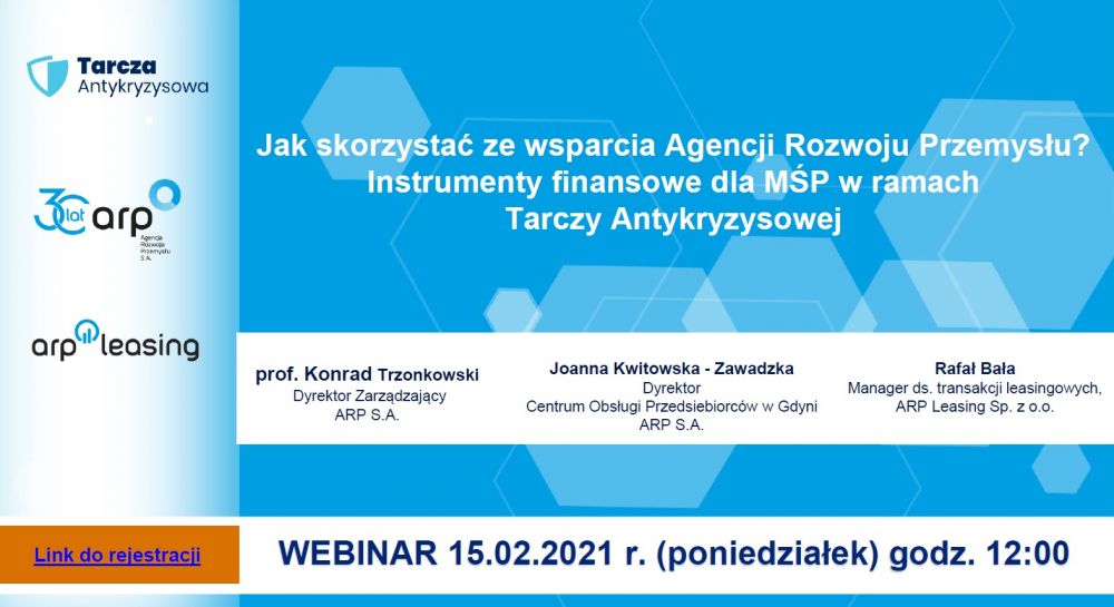 Pierwszy z cyklu webinariów odbędzie się 15 lutego 2021 roku o godz. 12:00 i skierowany będzie do przedsiębiorców działających na obszarze województwa pomorskiego oraz kujawsko-pomorskiego. Wydarzenie będzie poświęcone instrumentom wsparcia finansowego dla małych i średnich przedsiębiorców oferowanym przez Agencję Rozwoju Przemysłu w ramach Tarczy Antykryzysowej.