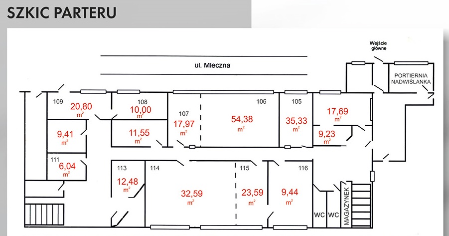 - Koszt wynajęcia budynku to 25 zł/m2 + media (cena podlega negocjacji w zależności od wynajętych powierzchni)