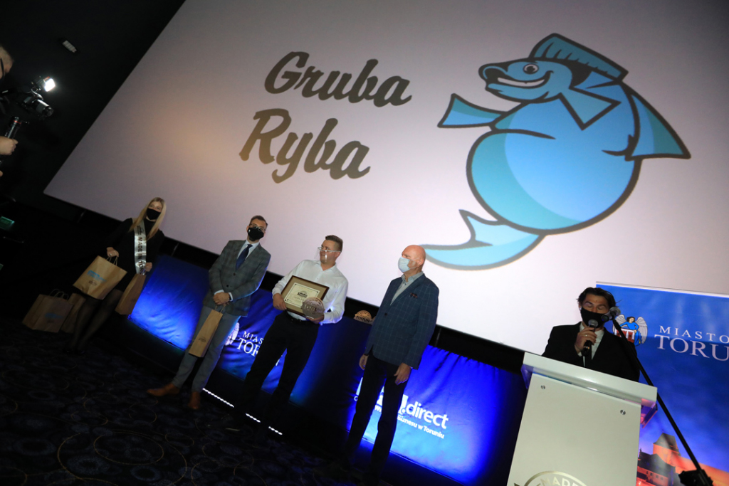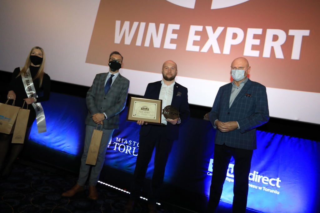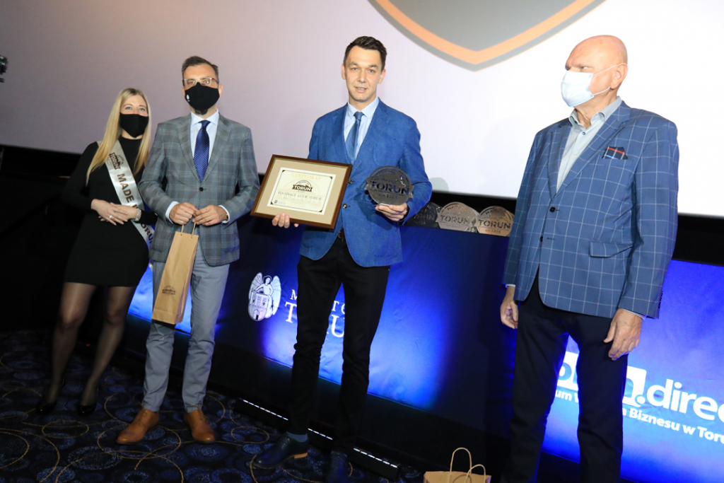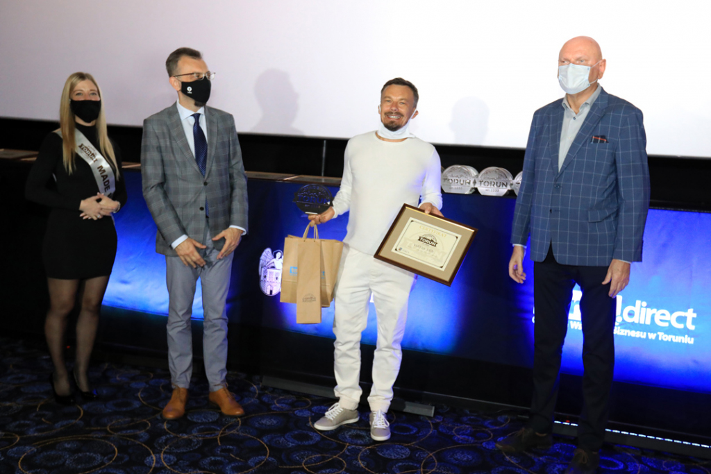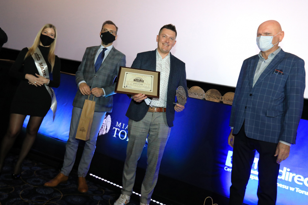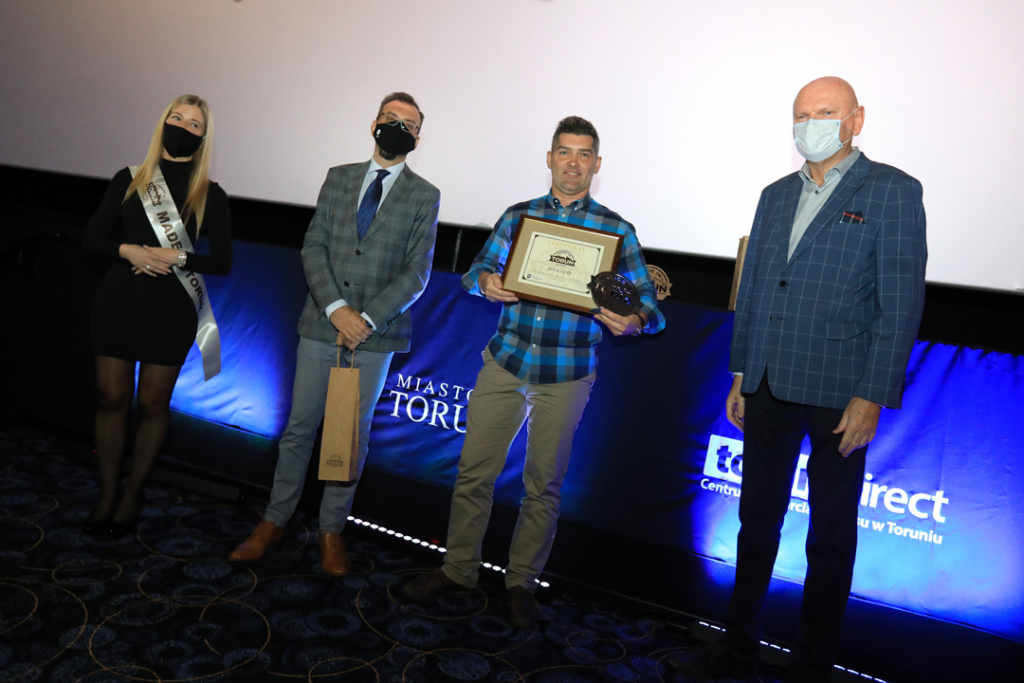 Zdjęcie zrobione podczas gali Made in Toruń. Laureat stoi na tle grafiki Made in Toruń. Prawą dłonią trzyma certyfikat, lewą zaciska i unosi do góry.